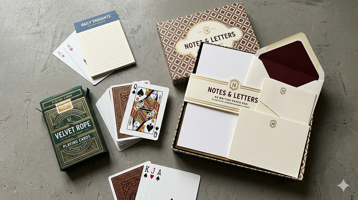 High-quality playing cards, stationery sets, and customized gift cards.